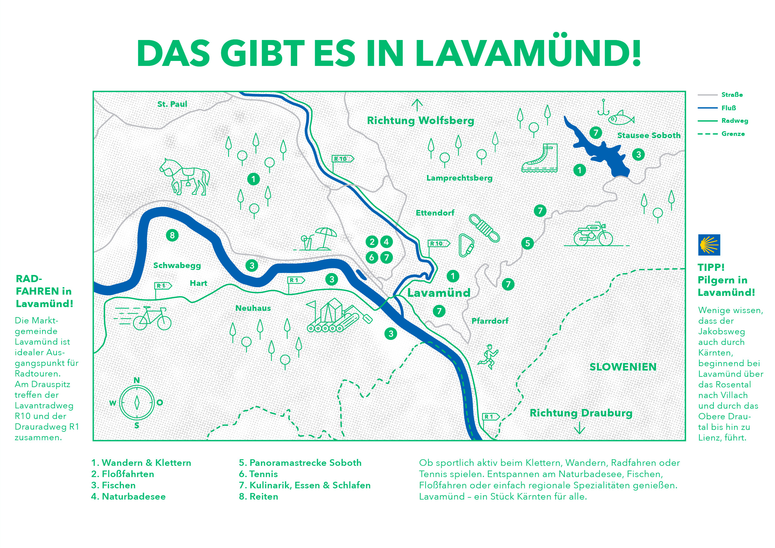 Für Radler, die auf dem Lavantradweg R10 oder dem Drauradweg R1 unterwegs sind, ist Lavamünd der ideale Ort um wieder Energie aufzutanken. Für diejenigen, die länger bleiben ist Lavamünd der ideale Ausgangspunkt für zahlreiche Radtouren und bietet mit vielen Mountainbikestrecken auch ein umfassendes Angebot. Frische klare Bergluft, saubere Gewässer, atemberaubende Natur laden zum Wandern, Klettern und Baden ein. Die artenreichen Flüsse Lavant und Drau bieten Anglern ideale Bedingungen für ihren Sport. Kulturelle Juwelen vom Mittelalter bis hin zur Moderne warten darauf, von Kulturbegeisterten entdeckt zu werden. Auf einem Floß den Draufluss zu genießen, gehört mit zu den Höhepunkten eines Aufenthaltes.